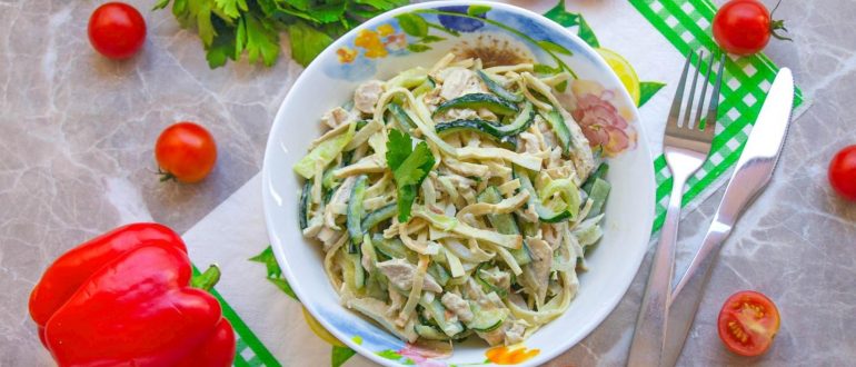 Мясной салат с яичными блинчиками и огурцами рецепт