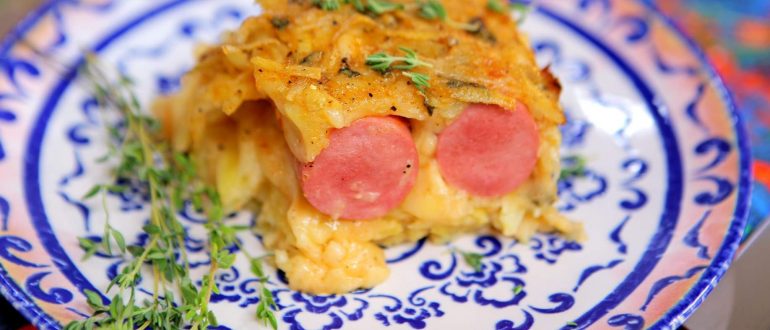 Запеканка с картофелем, перцем и сардельками (на сковороде) рецепт