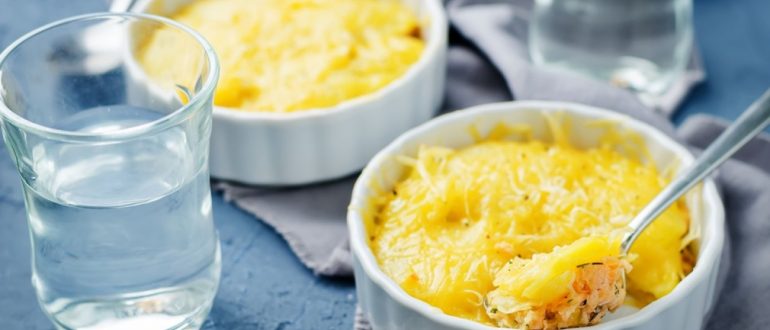 Картофельная запеканка с лососем и зеленым горошком рецепт
