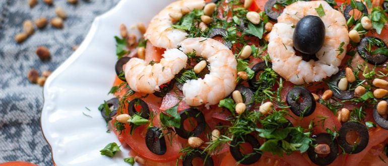 Салат «Рог изобилия» с икрой, креветками и семгой рецепт