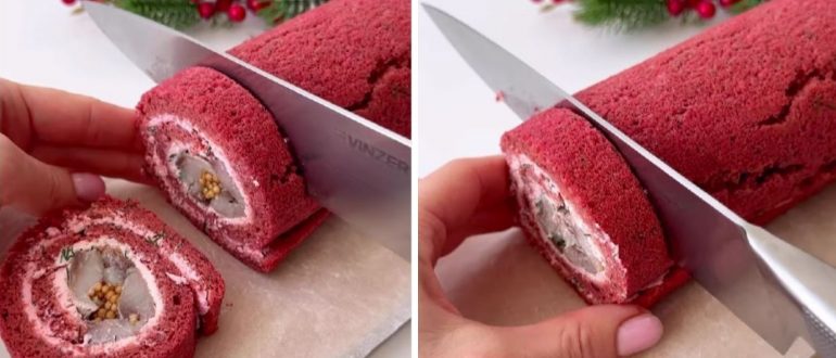 Закусочный свекольный рулет с начинкой из сельди, сливочного сыра и маринованных огурцов рецепт