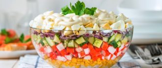Слоеный салат «Крабы в шубе», с рисом и сухариками рецепт